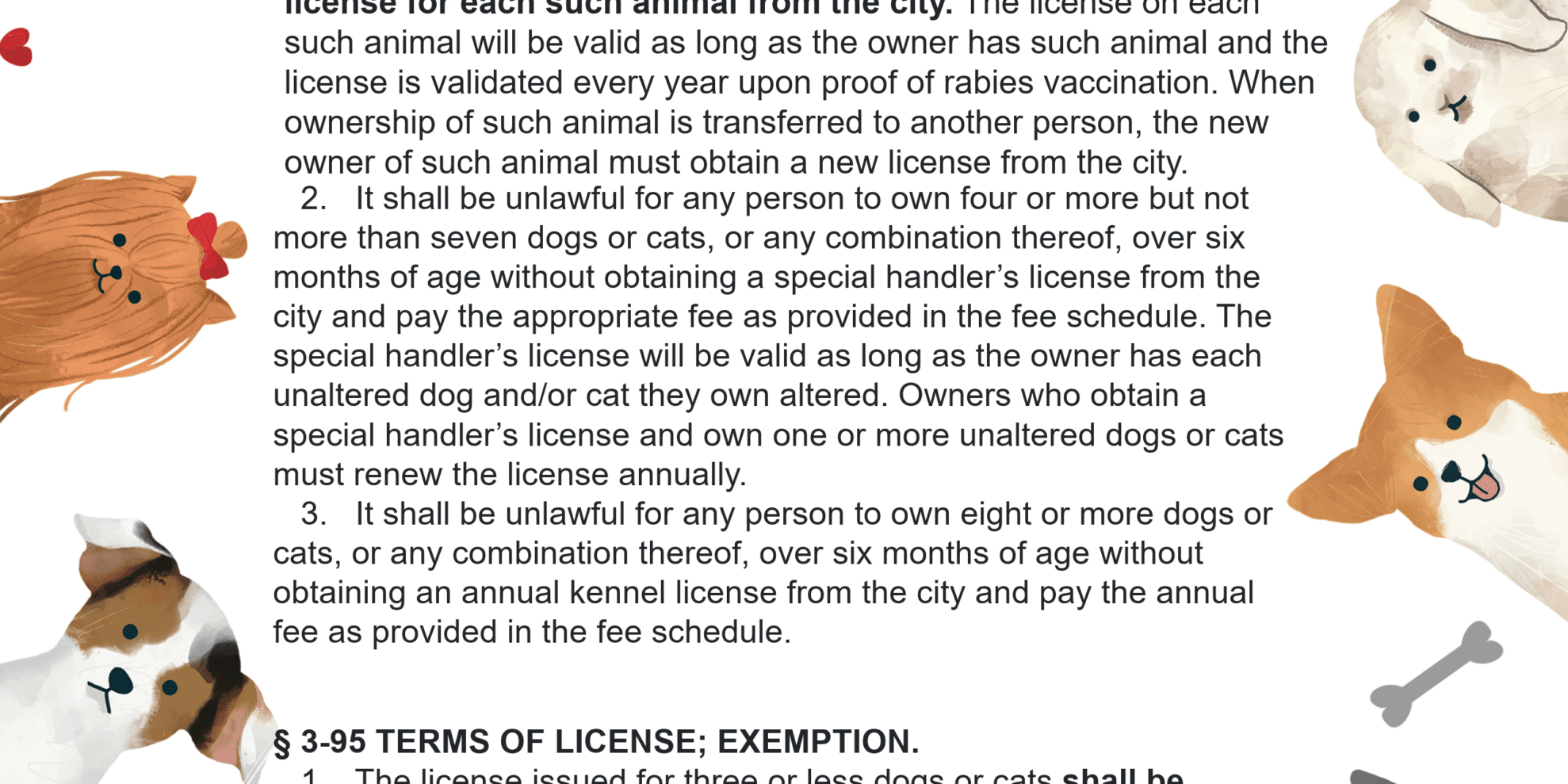 2. It shall be unlawful for any person to own four or more but not more than seven dogs or cats, or any combination thereof, over six months of age without obtaining a special handler’s license from the city and pay the appropriate fee as provided in the fee schedule. The special handler’s license will be valid as long as the owner has each unaltered dog and/or cat they own altered. Owners who obtain a special handler’s license and own one or more unaltered dogs or cats must renew the license annually.